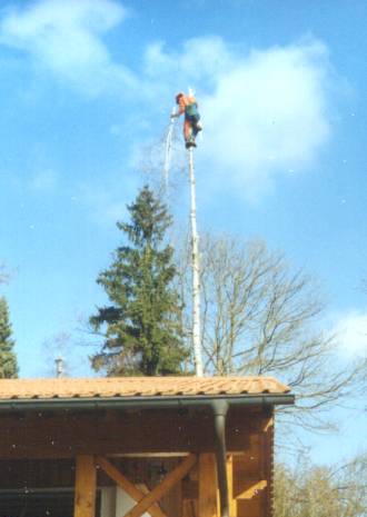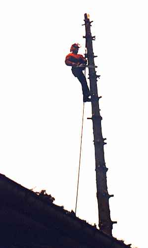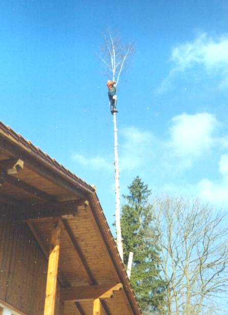 Der Arbeiter trägt von unten nach oben die Äste ab. Im zweiten Arbeitsschritt wird der Stamm stückweise abgetragen. Die anfallenden Baumteile können bei Bedarf mit einer speziellen Abseilbremse bodenschonend abgelassen werden. Mit Baumsteigeisen können auch Bäume mit glattem, astlosem Stamm sicher gefällt werden. Der Arbeiter ist durch einen Sitzgurt und einer umlaufenden Sicherung am Stamm gesichert und führt eine kompakte Motorsäge mit, die das Arbeiten mit einer Hand ermöglicht. Es besteht natürlich ausreichender Versicherungsschutz falls trotz aller Sicherheitsvorkehrungen etwas passieren sollte. | ||||||||||||||||||||||||||||||||||||||||||||||||||||||||||||||||||||||||||||||