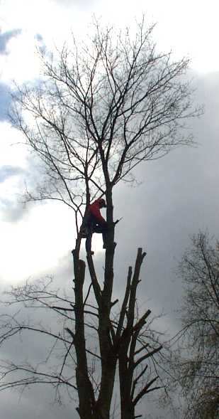 Der Arbeiter trägt von unten nach oben die Äste ab. Im zweiten Arbeitsschritt wird der Stamm stückweise abgetragen. Die anfallenden Baumteile können bei Bedarf mit einer speziellen Abseilbremse bodenschonend abgelassen werden. Mit Baumsteigeisen können auch Bäume mit glattem, astlosem Stamm sicher gefällt werden. Der Arbeiter ist durch einen Sitzgurt und einer umlaufenden Sicherung am Stamm gesichert und führt eine kompakte Motorsäge mit, die das Arbeiten mit einer Hand ermöglicht. Es besteht natürlich ausreichender Versicherungsschutz falls trotz aller Sicherheitsvorkehrungen etwas passieren sollte. | ||||||||||||||||||||||||||||||||||||||||||||||||||||||||||||||||||||||||||||||